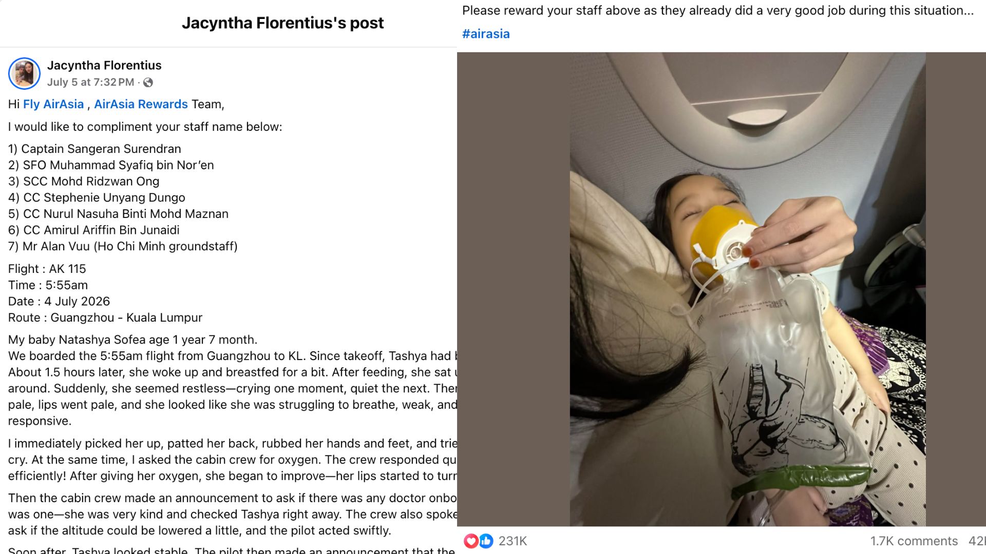 A heartfelt Facebook post has gone viral after a grateful parent shared how AirAsia staff acted swiftly and compassionately during a medical emergency involving her 1-year-old daughter aboard Flight AK115 from Guangzhou to Kuala Lumpur on July 4.